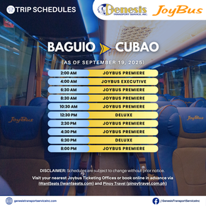 JoyBus is the Executive Class Service of Genesis Transport Group that offers a non-stop route to Baguio City and Baler, Aurora, popular tourist destinations. These buses come in two classes: Premiere and Executive. They are equipped with lazy-boy seats, a stewardess, a comfort area, blankets and snacks. Premiere has individual entertainment tablets on each passenger seat.